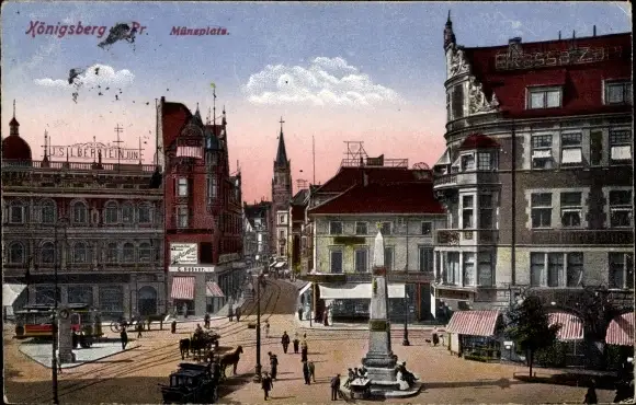 Ak Kaliningrad Königsberg Ostpreußen, Münzplatz, Geschäft, Straßenbahn