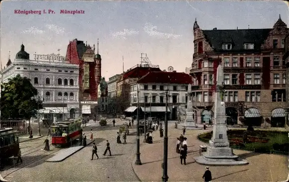 Ak Kaliningrad Königsberg Ostpreußen, Münzplatz, Straßenbahn, Statue