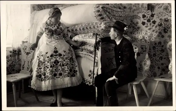 Ak Kalocsa Kollotschau Kaloča Ungarn, Paar in ungarischen Trachten, Paradezimmer