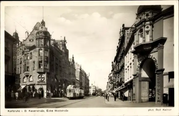 Ak Kalrsruhe Baden, Straßenbahn in der Kaiserstraße Ecke Waldstraße