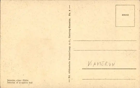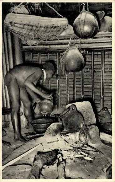 Ak Kamerun, Inneres einer Hütte, nackte Einheimische an der Kochstelle