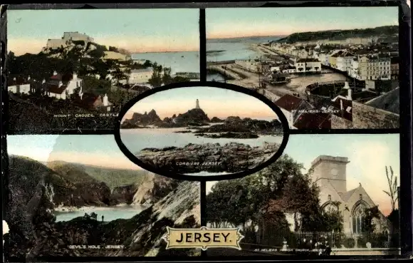 Ak Kanalinsel Jersey, Vorderseite zeigt vier Ansichten, Mount Crguel Castle, Corbiere, Devil's...