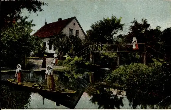 Ak Kannomühle Alt Zauche Wußwerk, Kahn im Spreewald, Trachten