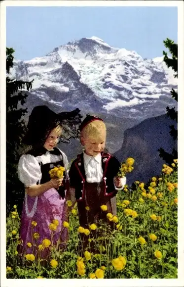 Ak Kanton Bern Schweiz, Zwei Kinder in Trachten, Alpen, Gelbe Blumen