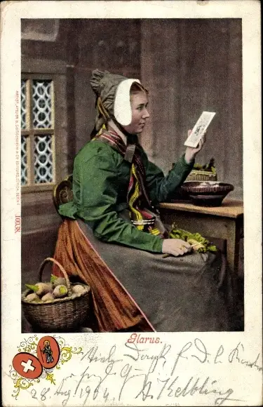 Ak Kanton Glarus, Frau in schweizerischen Trachten, Bauernstube