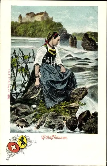 Ak Kanton Schaffhausen, Frau in Tracht, Wappen, Schloss