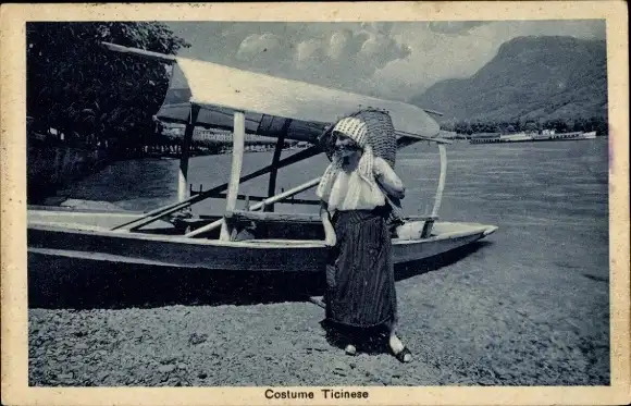 Ak Kanton Tessin, Frau in schweizerischer Tracht, Strand, Boot