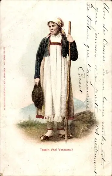 Ak Kanton Tessin Schweiz, Val Verzasca, Frau in Tracht, Hirtenstab