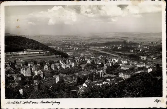 Ak Karlovy Vary Karlsbad Stadt, Gesamtansicht, Blick vom Dreikreuzberg