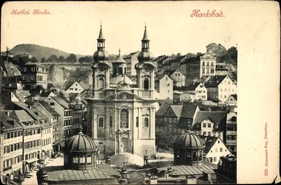 Ak Karlovy Vary Karlsbad Stadt, Katholische Kirche, Front, Umgebung