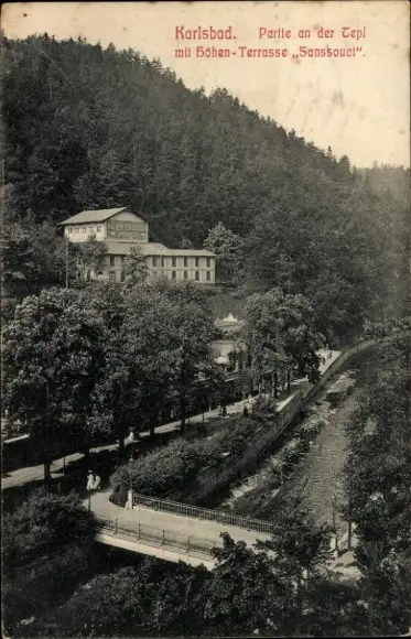 Ak Karlovy Vary Karlsbad Stadt, Partie an der Tepl, Höhen-Terrasse Sanssouci