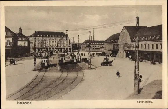 Ak Karlsruhe in Baden, Bahnhofplatz, Straßenbahnen