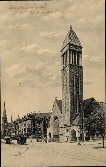 Ak Karlsruhe in Baden, Durlacher Allee mit Lutherkirche, Straßenbahn