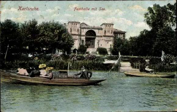 Ak Karlsruhe in Baden, Festhalle, See, Ruderboote
