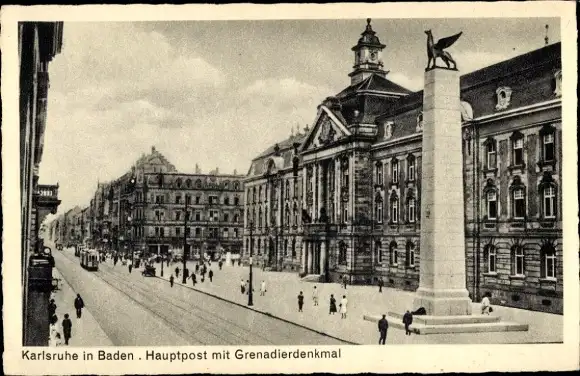 Ak Karlsruhe in Baden, Hauptpost, Grenadierdenkmal, Straßenbahn