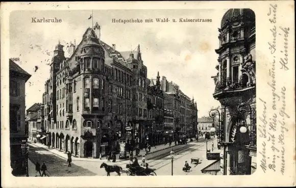 Ak Karlsruhe in Baden, Hofapotheke, Waldstraße, Kaiserstraße, Kutsche