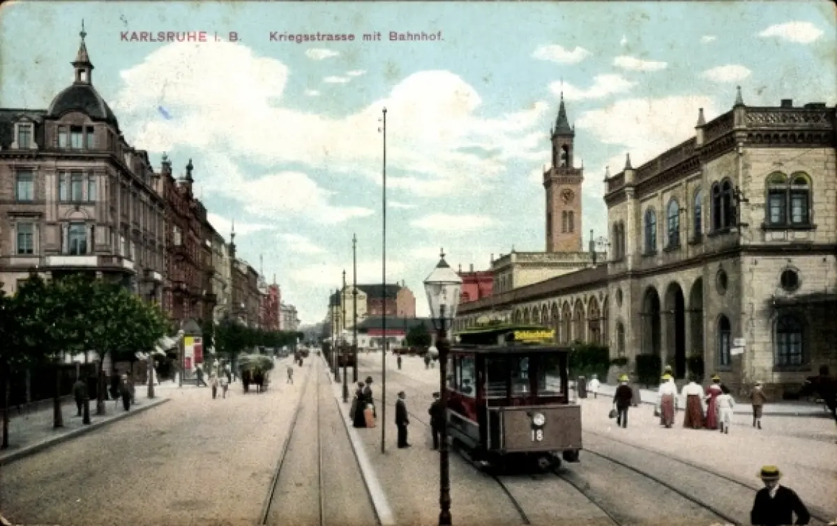 Ak Karlsruhe in Baden, Kriegsstraße, Bahnhof, Straßenbahn, Kirchturm