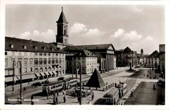 Ak Karlsruhe in Baden, Marktplatz, Straßenbahnen, Kirchturm