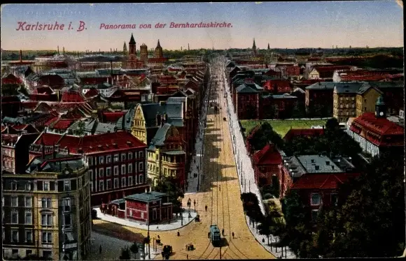 Ak Karlsruhe in Baden, Panorama, Blick von der Bernharduskirche, Straßenbahn
