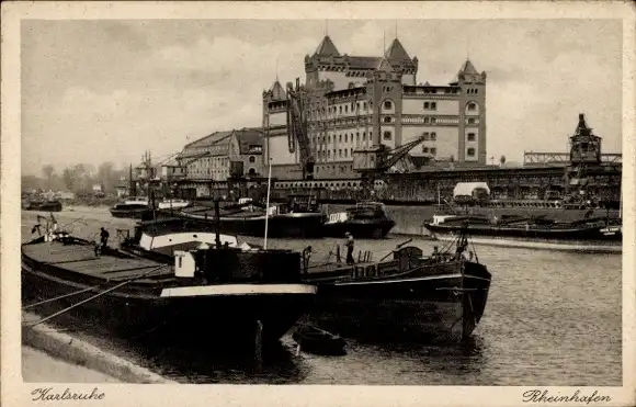 Ak Karlsruhe in Baden, Rheinhafen, Frachtschiffe