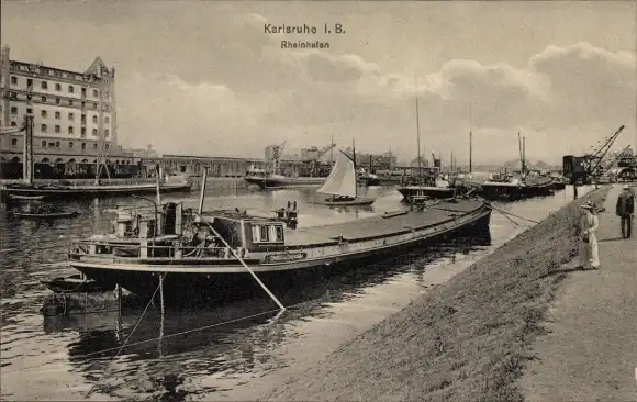 Ak Karlsruhe in Baden, Rheinhafen, Kräne, Schiffe, Promenade