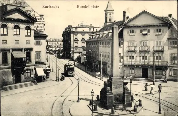 Ak Karlsruhe in Baden, Rundellplatz, Denkmal, Straßenbahn