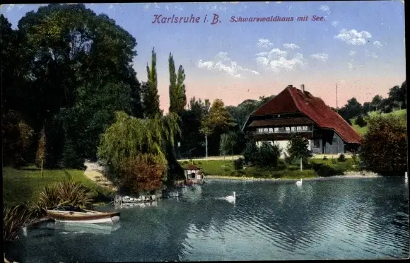 Ak Karlsruhe in Baden, Schwarzwaldhaus mit See