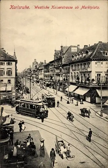 Ak Karlsruhe in Baden, Westliche Kaiserstraße ab Marktplatz, Straßenbahnen
