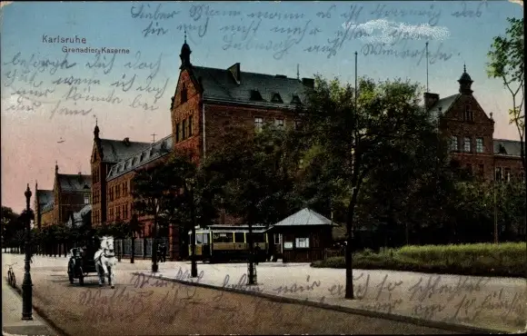 Ak Karlsruhe in Baden Württemberg, Grenadier Kaserne, Straßenbahn