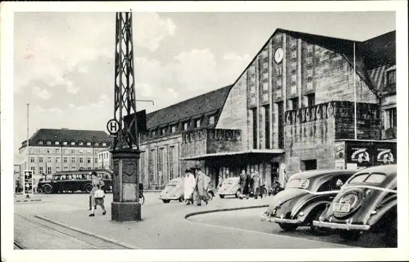 Ak Karlsruhe in Baden Württemberg, Hauptbahnhof, Außenansicht, Vordereingang, Autos, Fußgänger
