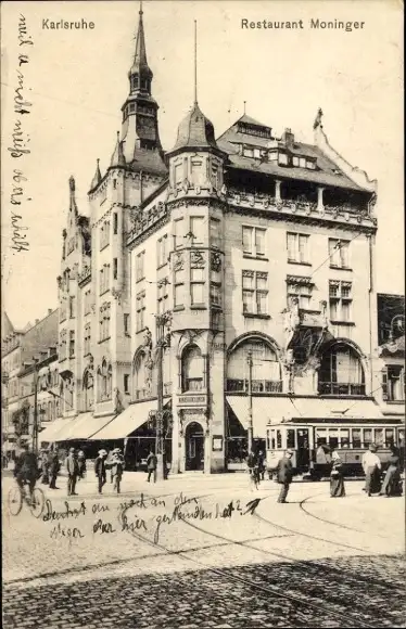 Ak Karlsruhe in Baden Württemberg, Restaurant Moninger, Straßenbahn