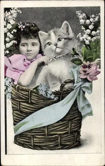 Ak Katze und Mädchen in einem Weidenkorb, Blumen