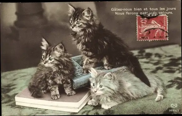 Ak Katzen, drei junge Kätzchen auf einem Tisch, Bücher
