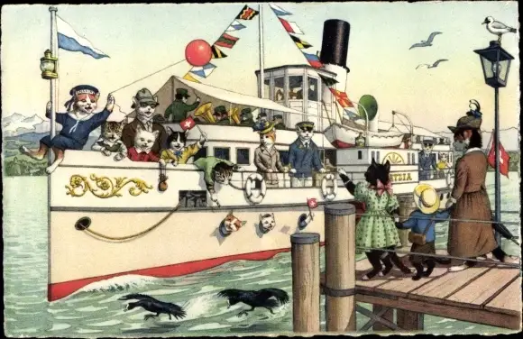 Ak Katzen verabschieden ihre Familie, Katzen mit Schiff unterwegs