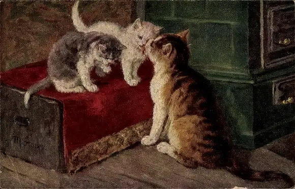 Ak Katzenfamilie, Katzenmutter pflegt ihre Kinder