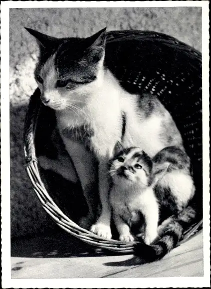 Ak Katzenmutter mit Babykatze in einem Weidenkorb