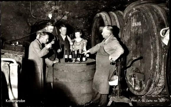 Ak Kellerprobe, Weinkeller, Weinfässer, Winzer