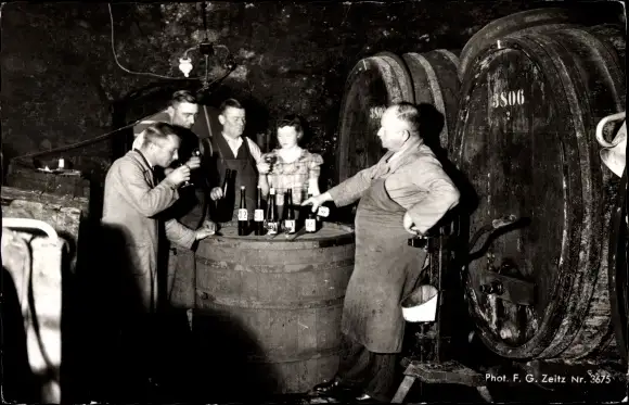 Ak Kellerprobe, Weinkeller, Weinfässer, Winzer