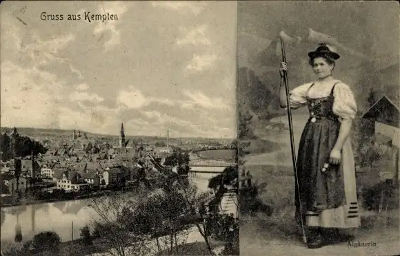 Ak Kempten im Allgäu Schwaben, Stadtansicht von Frau in alpenländischer Tracht
