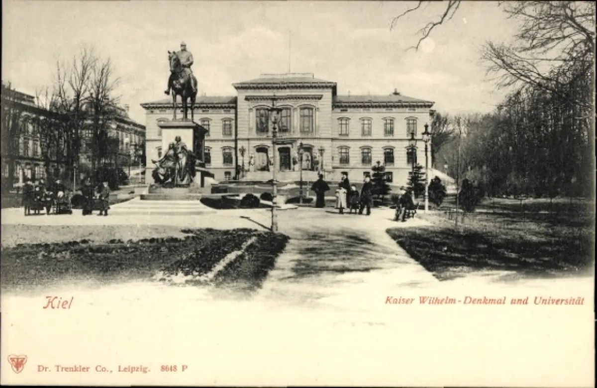 Ak Kiel, Kaiser Wilhelm-Denkmal, Universität, Reiterstatue, Park, Menschen