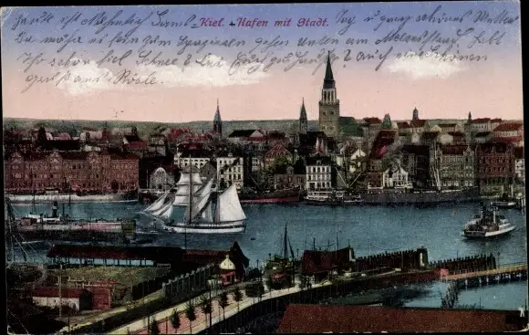 Ak Kiel Schleswig Holstein, Hafen mit Stadt, Boote, Kirchturm