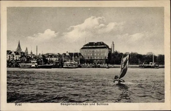 Ak Kiel Schleswig Holstein, Seegartenbrücken und Schloss, Schiffe, Boot