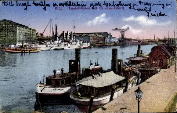 Ak Kiel in Schleswig Holstein, Handelshafen, Germaniawerft, Dampfer, Kriegsschiff