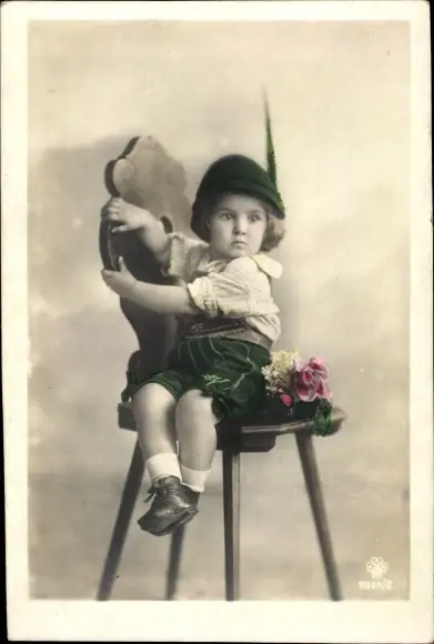 Ak Kind-Portrait, Tracht, Stuhl, Blumen