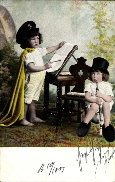 Ak Kind am Stehpult, Kind mit Pfeife auf dem Nachttopf
