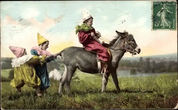 Ak Kind auf Esel reitend, Wiese, Karnevalkostüm
