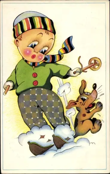 Ak Kind auf Skiern fährt Hund über den Schwanz