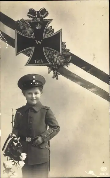 Ak Kind in Uniform, Eisernes Kreuz, Propaganda