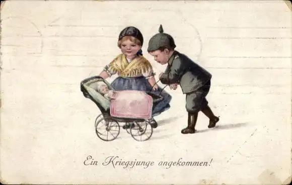 Ak Kind in Uniform, Pickelhaube, Kinderwagen, Mutter, Kind, Ein Kriegsjunge angekommen