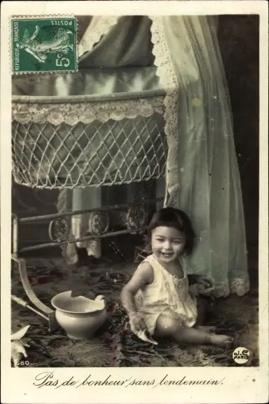 Ak Kind mit zerbrochenem Nachttopf, Wiege